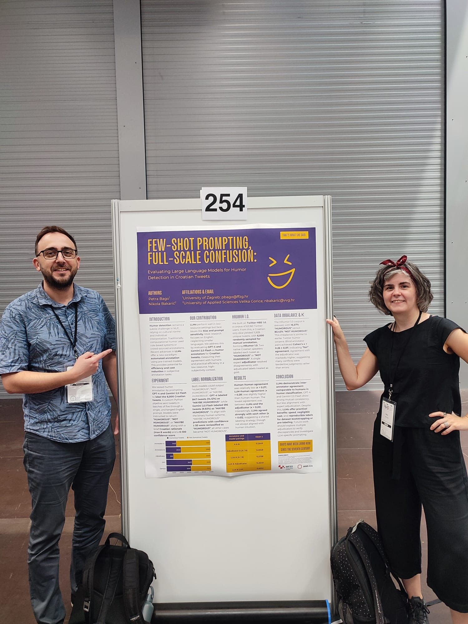 Slavic Natural Language Processing 2025 održan je 31. srpnja 2025. u Beču na kojemu je projektna suradnica dr. sc. Petra Bago s Filozofskoga fakulteta u Zagrebu u suradnji s kolegom dr. sc. Nikolom Bakarićem s Veleučilišta Velika Gorica održala izlaganje i poster-prezentaciju Few-Shot Prompting, Full-Scale Confusion: Evaluating Large Language Models for Humor Detection in Croatian Tweets. Cilj je Slavic NLP-ja okupiti istraživače iz akademske zajednice i industrije u području prirodne obrade jezika i velikih jezičnih modela s primjenom na slavenske jezike. Program svih izlaganja dostupan je ovdje.